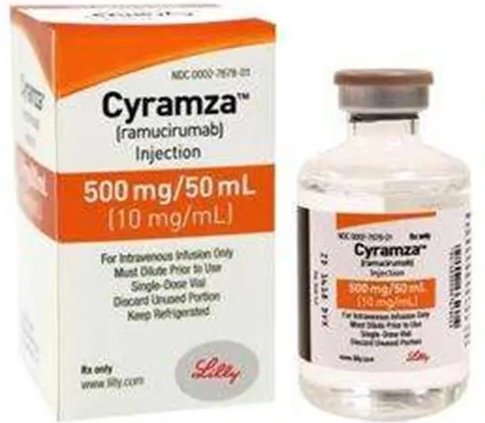 Ramucirumab (ramucirumab) is a type of drug called a monoclonal antibody, which works by stopping the growth of cancer cells. When stomach cancer or cancer located at the junction of the stomach and esophagus (the tube between the throat and stomach) does not improve after treatment with other drugs, ramucirumab injection may be used alone or in combination with another chemotherapy drug to treat these conditions. Ramucirumab is also used in combination with docetaxel to treat a certain type of non-small cell lung cancer (NSCLC) that has spread to other parts of the body and is not improving or getting worse in people treated with other chemotherapy drugs. It is also used in combination with erlotinib (Tarceva) to treat a certain type of non-small cell lung cancer that has spread to other parts of the body. Ramucirumab is also used in combination with other chemotherapy drugs to treat cancer of the colon (large intestine) or rectum in people who have been treated with other chemotherapy drugs and have not improved or gotten worse. Ramucirumabis also used alone to treat certain patients with hepatocellular carcinoma (HCC; a type of liver cancer) who have been treated with sorafenib (Nexafar ).