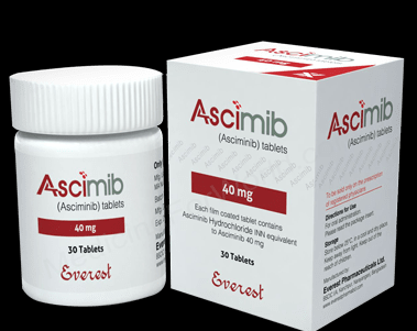 Asciminib (scemblix/asciminib) is a kinase inhibitor used to treat adult patients with the following: CML) in the chronic phase (CP), previously treated with two or more tyrosine kinase inhibitors (TKIs) and T315Imutated chronic myelogenous leukemia Ph+chronic myelogenous leukemia.