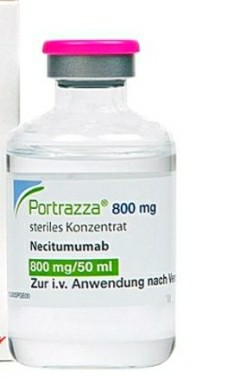 Necitumumab is a recombinant human anti-EGFR monoclonal antibody whose structure is similar to cetuximab. However, due to the lack of murine structure, allergic reactions are expected to be less common with cetuximab compared with cetuximab. In a phase 3 trial in first-line advanced non-squamous non-small cell lung cancer, nesituzumab was combined with pemetrexed and cisplatin.