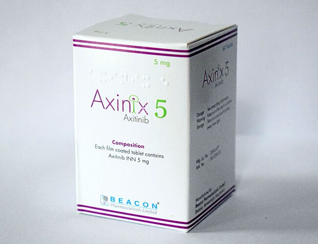 Axitinib/Axitinib is a targeted cancer drug. Axitinib is used alone to treat advanced renal cell carcinoma (RCC) for patients who have failed other drug treatments. Axitinib is used in combination with avelumab (bave ncio) or pembrolizumab (Keytruda) to treat advanced renal cell carcinoma. Axitinib belongs to the kinase inhibitor class of drugs. Axitinib works by blocking the activity of an abnormal protein that sends a reproduction signal to cancer cells, which helps slow or prevent the spread of cancer cells.